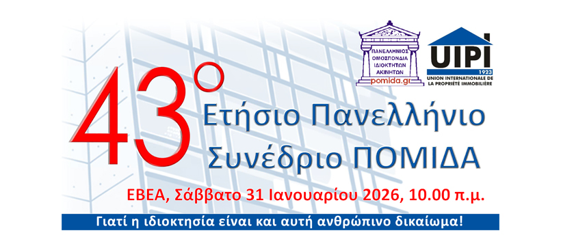 Το Διοικητικό Συμβούλιο της Π.ΟΜ.ΙΔ.Α. προσκαλεί τους εκπροσώπους των σωματείων-μελών της και των παραρτημάτων όλης της χώρας, στο 43o ετήσιο ΠΑΝΕΛΛΗΝΙΟ ΣΥΝΕΔΡΙΟ της και η Ενωσις Ιδιοκτητών Ελλαδος τα μέλη της στην Τακτική Ετήσια Γενική Συνέλευση το Σάββατο, 31η Ιανουαρίου 2026, 10.00 – 14.00, στο Εμπορικό και Βιομηχανικό Επιμελητήριο Αθηνών (ΕΒΕΑ, Αίθουσα ΕΡΜΗΣ), Ακαδημίας 7, Αθήνα, με τα εξής θέματα: